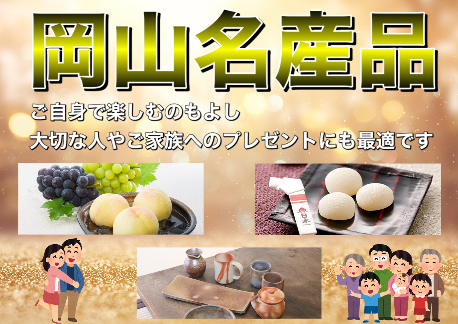 岡山名産品例:地元のお菓子、お茶。陶芸品、協賛店舗や地域でご使用可能なサービスチケット等