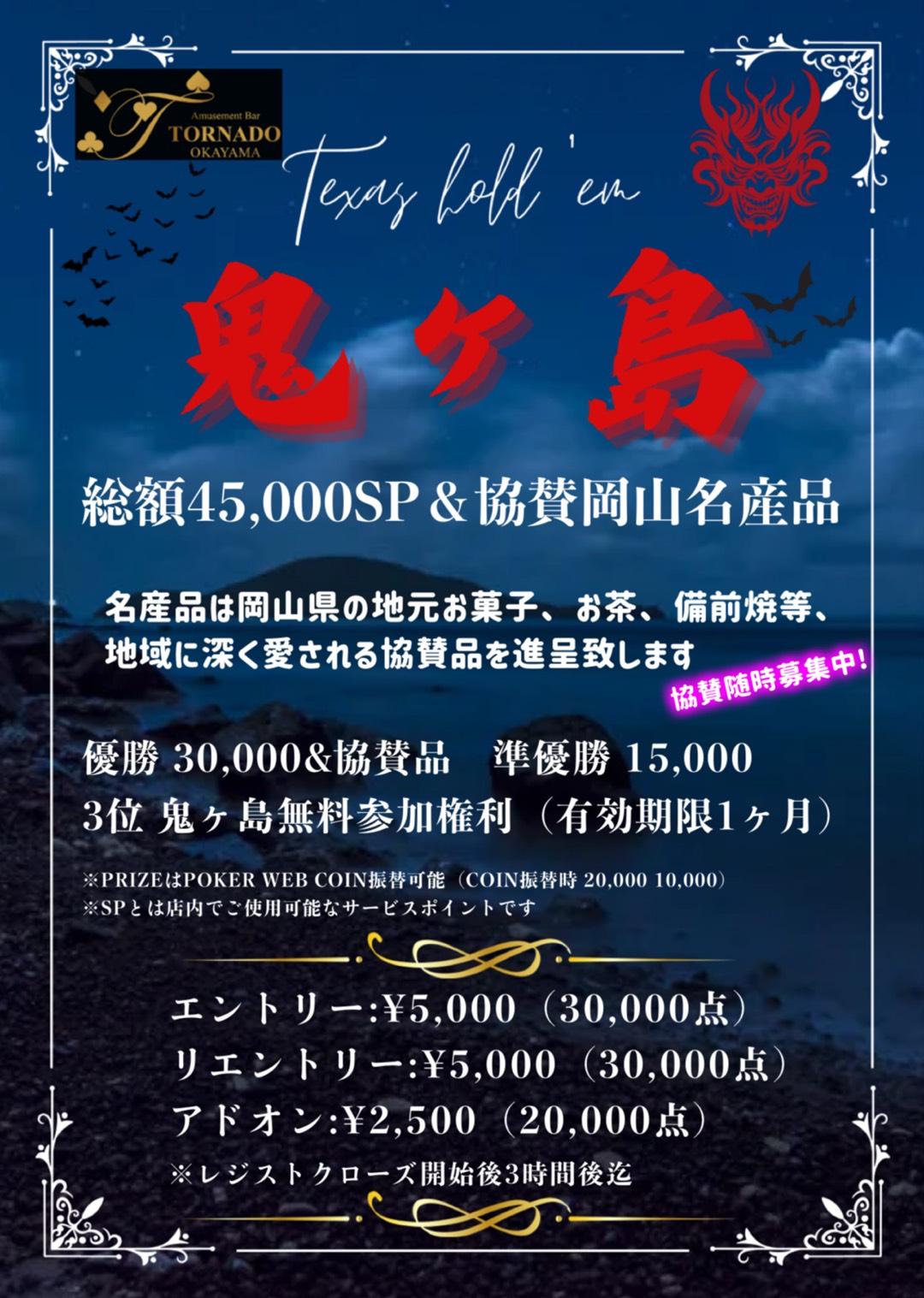🔶未経験・初心者〜上級者まで幅広い層が楽しめるイベントです。上位入賞者様は総額45,000SP+協賛岡山名産品進呈。 上位3名様が入賞。事前予約の必要はありません。飛び込み参加大歓迎です。ご新規様やお一人様、女性の方でもお気軽にご参加頂けます。 「鬼ヶ島」のレイトレジストはイベント開始後約3時間です。