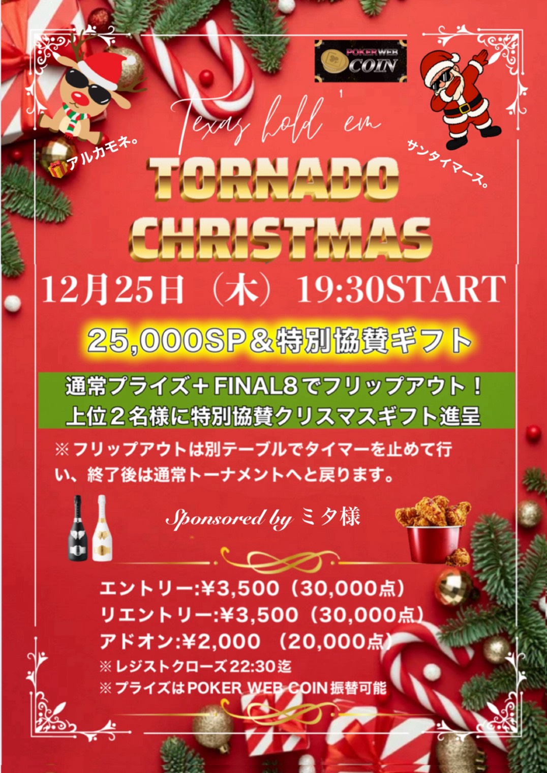 🔶クリスマス限定のスペシャルトーナメント、クリスマス限定のスペシャルフリップアウトも御座います!未経験・初心者〜上級者まで幅広い層が楽しめるイベントです。上位入賞者様は総額25,000SPやリングチップを獲得可能です。 事前予約の必要はありません。飛び込み参加大歓迎です。ご新規様やお一人様、女性の方でもお気軽にご参加頂けます。 「TORNADO CHRISTMAS」のレイトレジストはイベント開始後約3時間です。