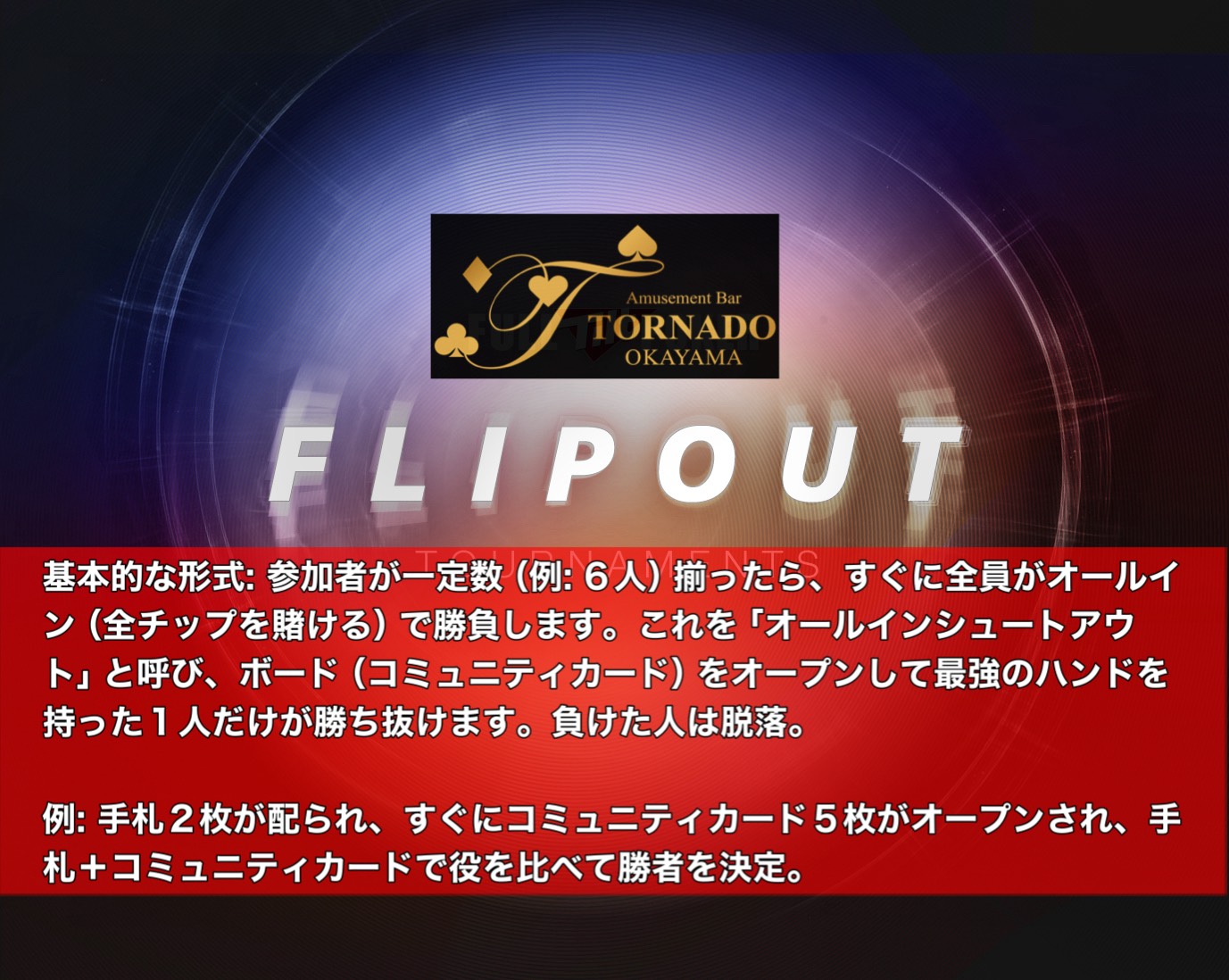 ※レジストクローズ後にトーナメントが残り8名になった時点でトーナメントのタイマーをストップして、別テーブルでスタート致します。完全運ゲーなので、技術は一切不要!勝敗の判定もディーラーが致しますので、ひたすら祈るのみ!!上位2名に残れば協賛プライズ獲得!負けてもリスクは何もありません、終了次第通常トーナメント再開致します。