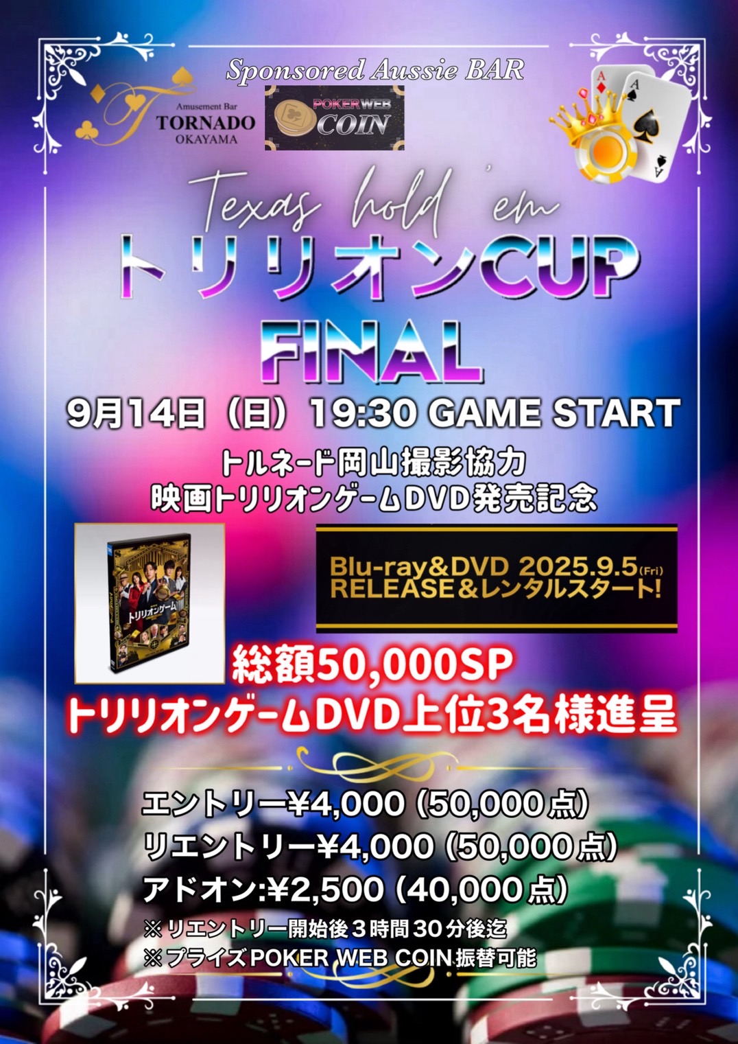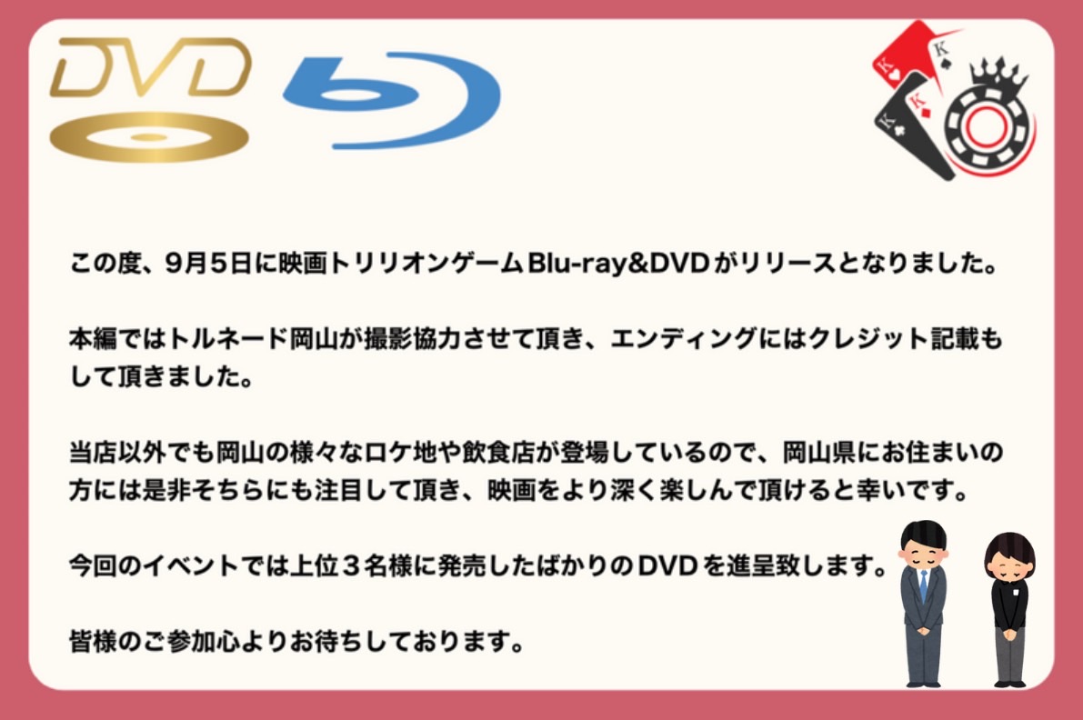 🔶映画トリリオンゲームDVD発売記念イベント、未経験・初心者〜上級者まで幅広い層が楽しめるイベント。上位入賞者様は総額50,000SPを獲得可能です。POKER WEB COINに振替も可能。 更に発売したばかりのDVDを上位3名様に進呈。事前予約の必要はありません。飛び込み参加大歓迎です。ご新規様やお一人様、女性の方でもお気軽にご参加頂けます。 イベントのレイトレジストはイベント開始後約3時間30分です。
