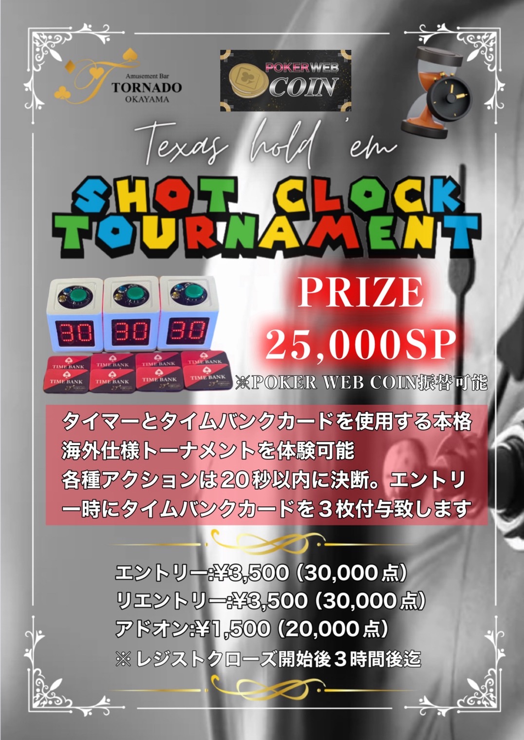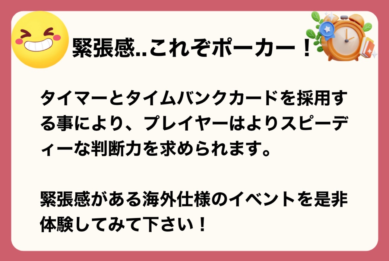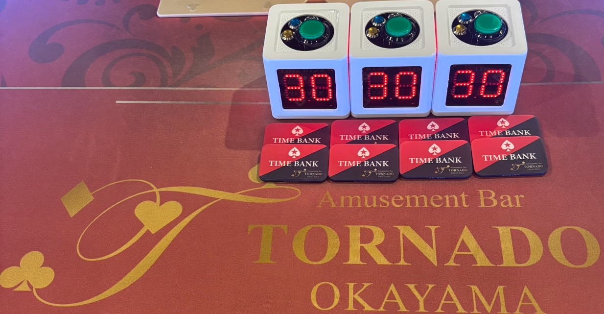 通常のトーナメントと異なり専用タイマーと特注のタイムバンクカードを使用します。海外仕様の本格トーナメントを岡山県で体験できます!時間を各種アクションは20秒以内に決断。エントリー時にタイムバンクカードを3枚付与致します。リエントリー時は3枚未満の場合は最大3枚まで補充可能。