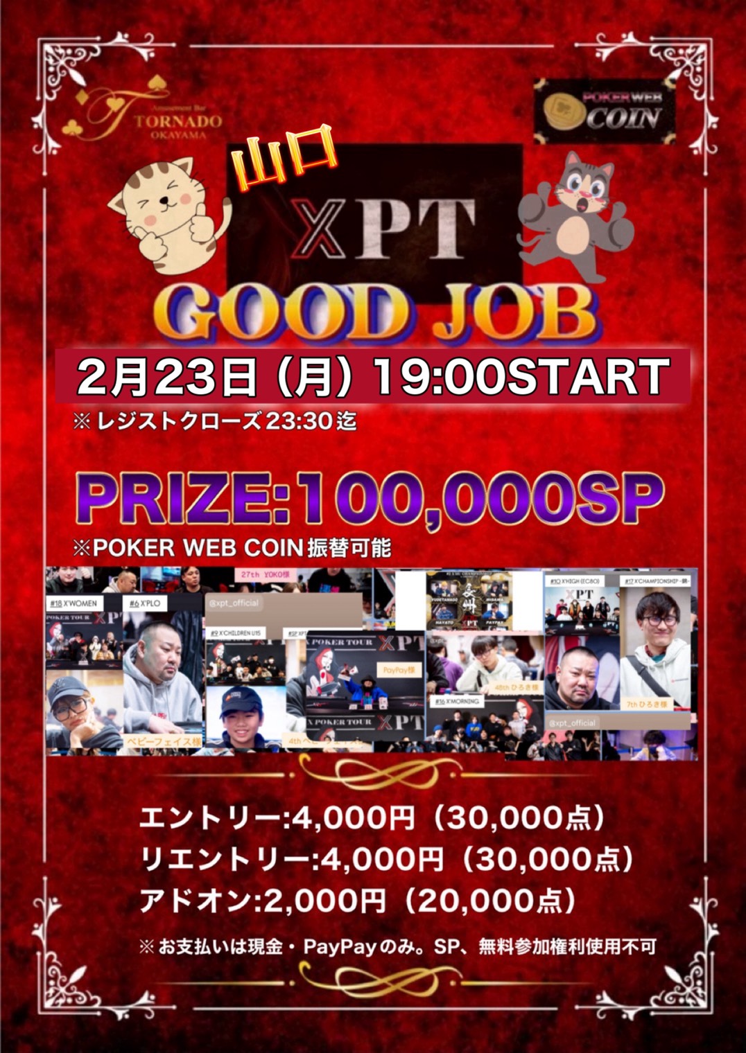 ポーカートーナメントの雰囲気を味わいたい方にもオススメ!岡山県外のお客様やご新規様もお気軽にご参加下さいませ。 XPTに参加していない方のご参加も大歓迎です!