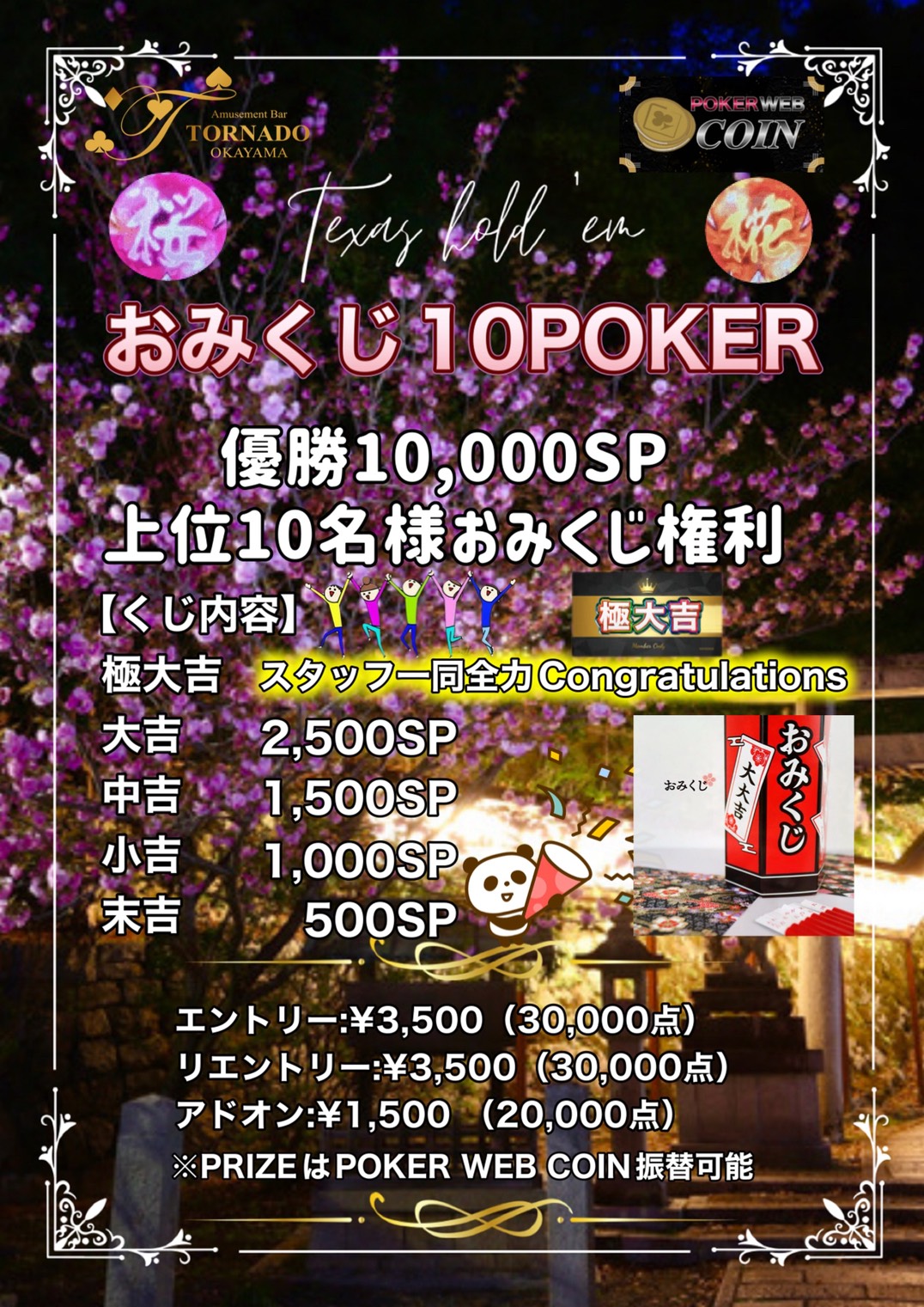 上位10名様が特製おみくじを引けるトーナメントイベント。3名様以上集まり次第スタートのsit&go方式となります。