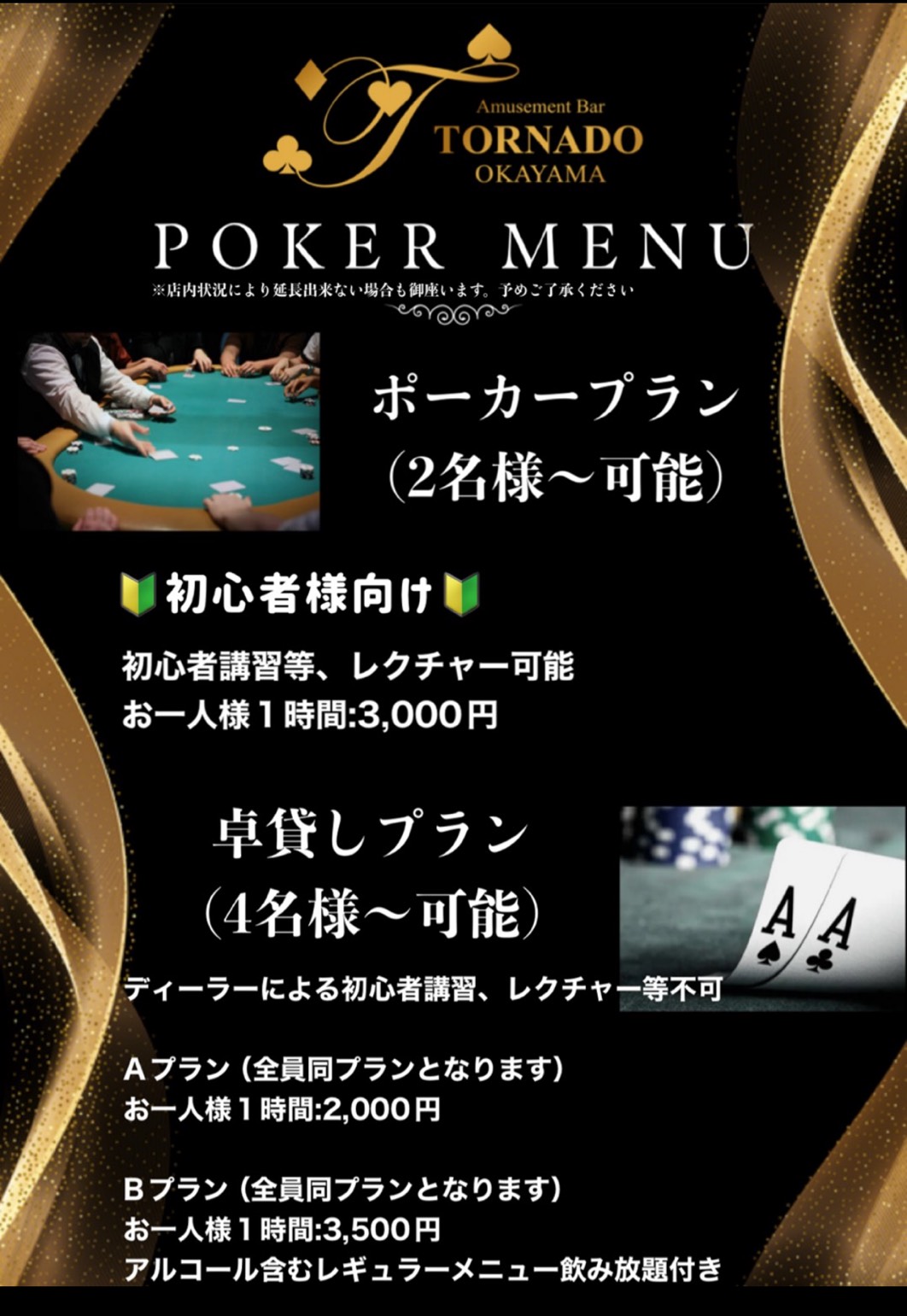 ルールがわからなくても女性ディーラーが未経験者様にルール説明を行っております。ポーカーは、なんとなくイメージ的に敷居が高いかもしれませんが、当店のお客様の8割がポーカーをするキッカケとなったのが「TORNADO岡山」です!とりあえず暇つぶしや話のネタに行ってみよっか!そんな感覚で気軽にお越し下さいませ。スタッフ一同お待ちしております!
