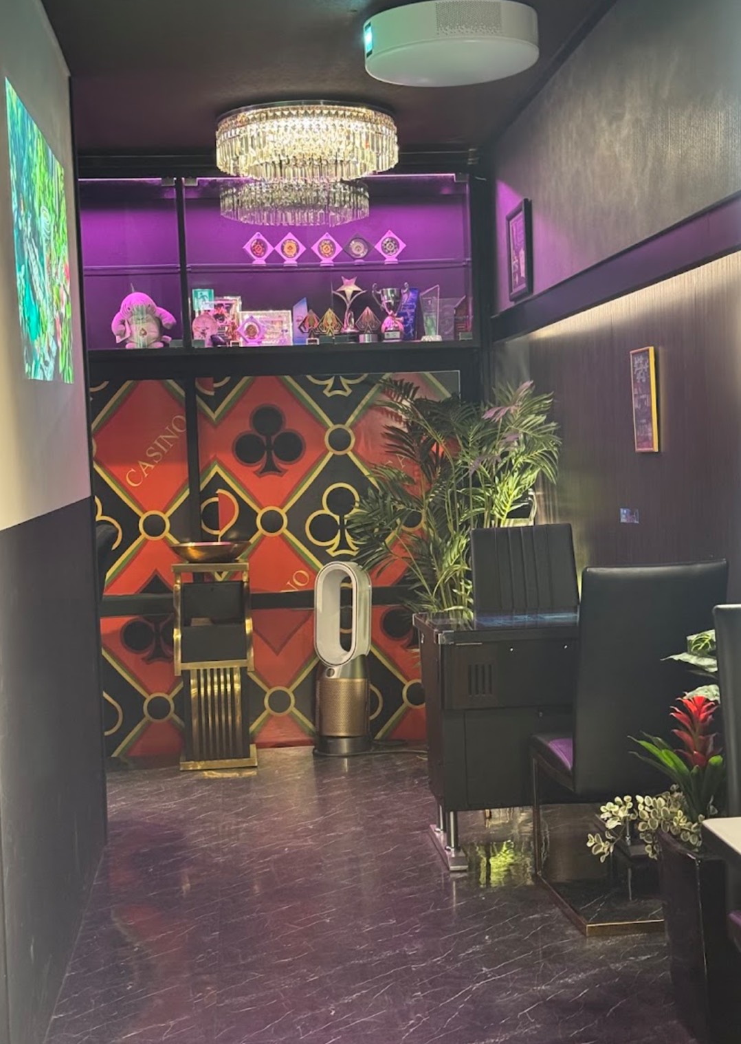 休憩スペースには大型プロジェクターも完備。主に海外のポーカートーナメントの動画をLIVE中継しています。間接照明やスペース奥の天井には特注製シャンデリア、更に特注のトロフィースペースを設置。世界各国で獲得したトロフィーを展示しております。